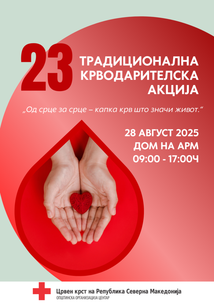 Црвен крст на Република Северна Македонија Општинската организација Центар и Институтот за трансфузиона медицина на Република Северна Македонија, по повод празникот Успение на Пресвета Богородица, на 28.08.2025 година, традиционално по дваесет и трети пат организира крводарителска акција.