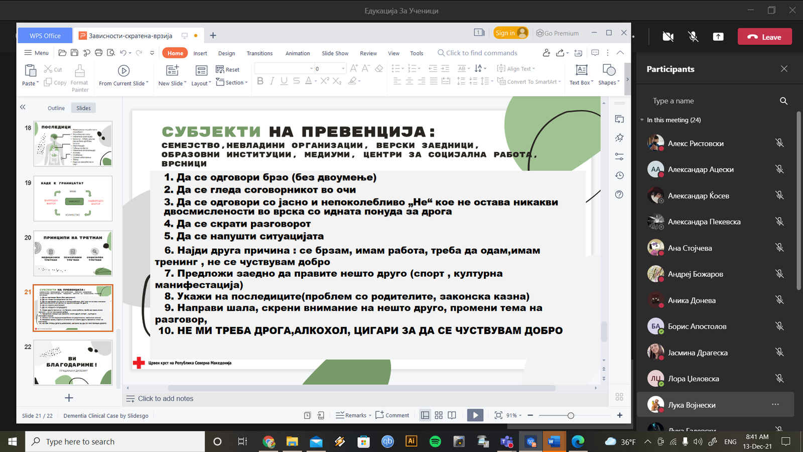 Црвениот крст на Република Северна Македонија, секоја година месец ноември го одбележува како Месец на борба против болести на зависност. Црвен крст на Република Северна Македонија – Општинска организација Центар реализираше едукација во ООУ „Димитар Миладинов“ за учениците од 6то и 7мо одделение. На едукацијата присуствуваа вкупно 144 ученици. Едукацијата, која се реализираше преку платформата Teams, ги поттикна учениците да размислат за штетноста од цигарите, дрогата и алкохолот, а се информираа и за последиците кои зависностите ги оставаат врз здравјето на човекот. Продолжуваме со online едукации и во другите училишта на територија на општина Центар.