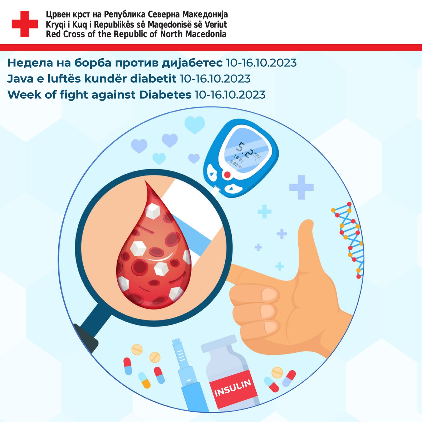 Црвениот крст на Република Северна Македонија во периодот од 10ти до 16ти октомври 2023 година традиционално ја одбележува Неделата на борба против шеќерна болест (дијабетес) под мотото „Здрави животни навики во превенција на дијабетес“.