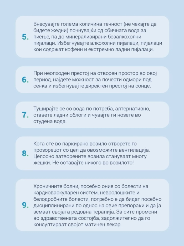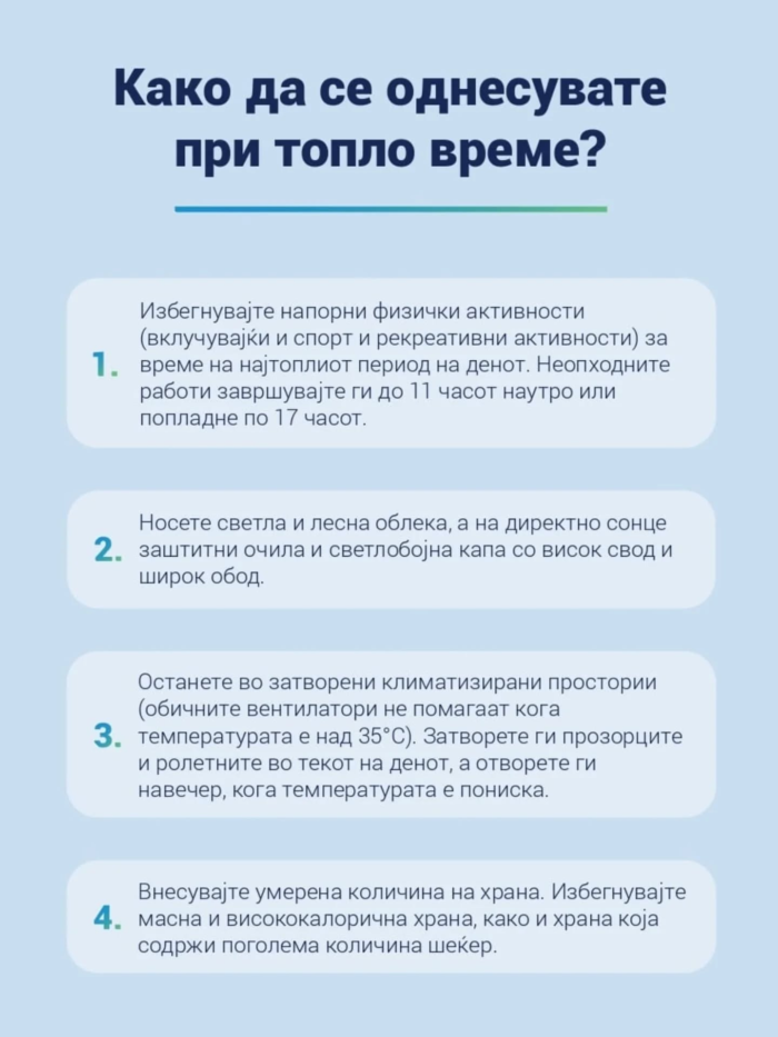 јуни 30, 2025Препораки за заштита на населението од топлотни бранови”КАКО ДА СЕ ОДНЕСУВАМЕ ПРИ ВИСОКИ ТЕМПЕРАТУРИ?” < врати се назад