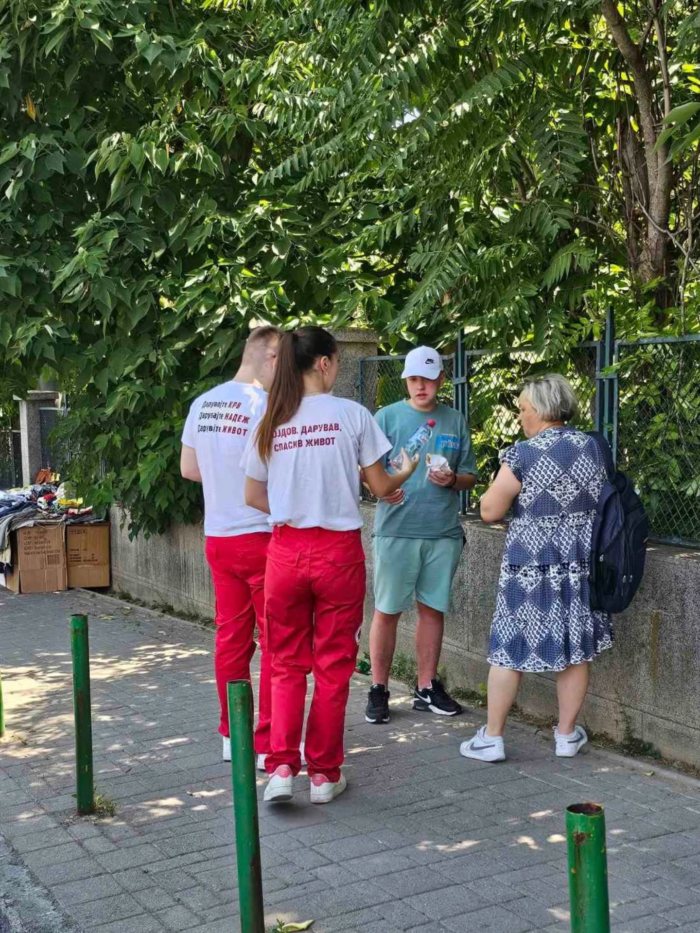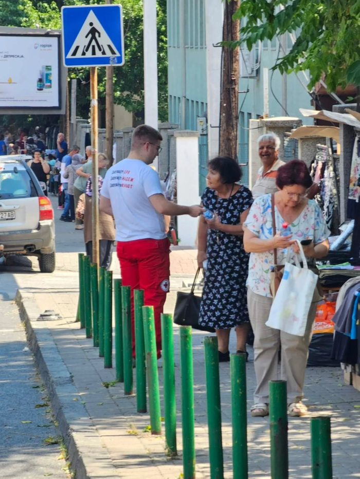 Волонтери од Клубот на млади на Црвен крст на Република Северна Македонија Општинска организација Центар на 07.07.2025 (Понеделник) и 08.07.2025 (Вторник) во периодот на највисокото искачување на топлинскиот бран од 11ч до 14ч поделија флаширана вода како превенција и намалување на можностите да настане топлотна исцрпеност кај населението на територија на Општина Центар.