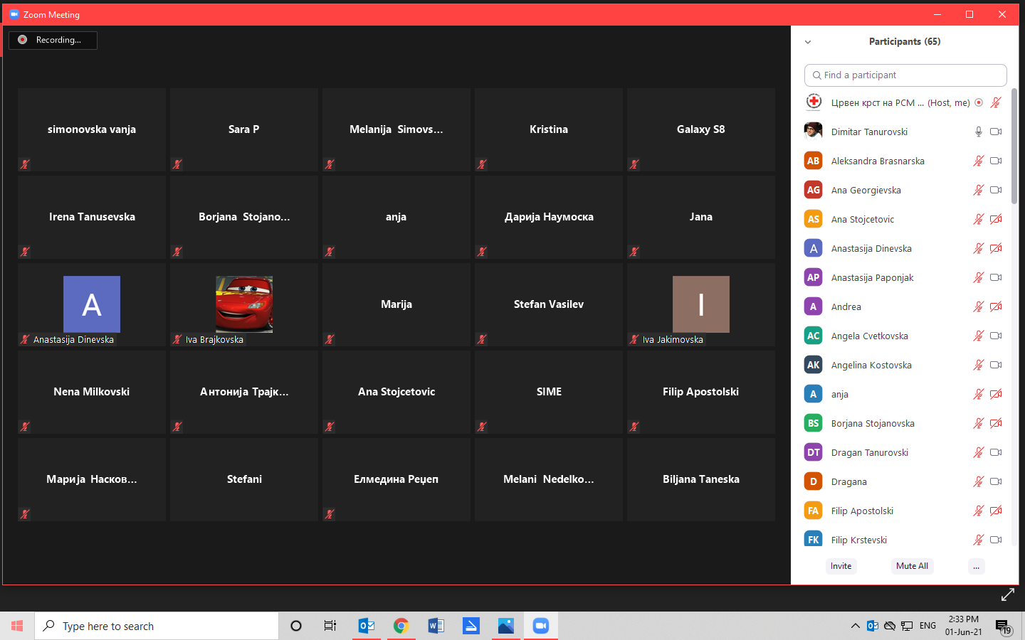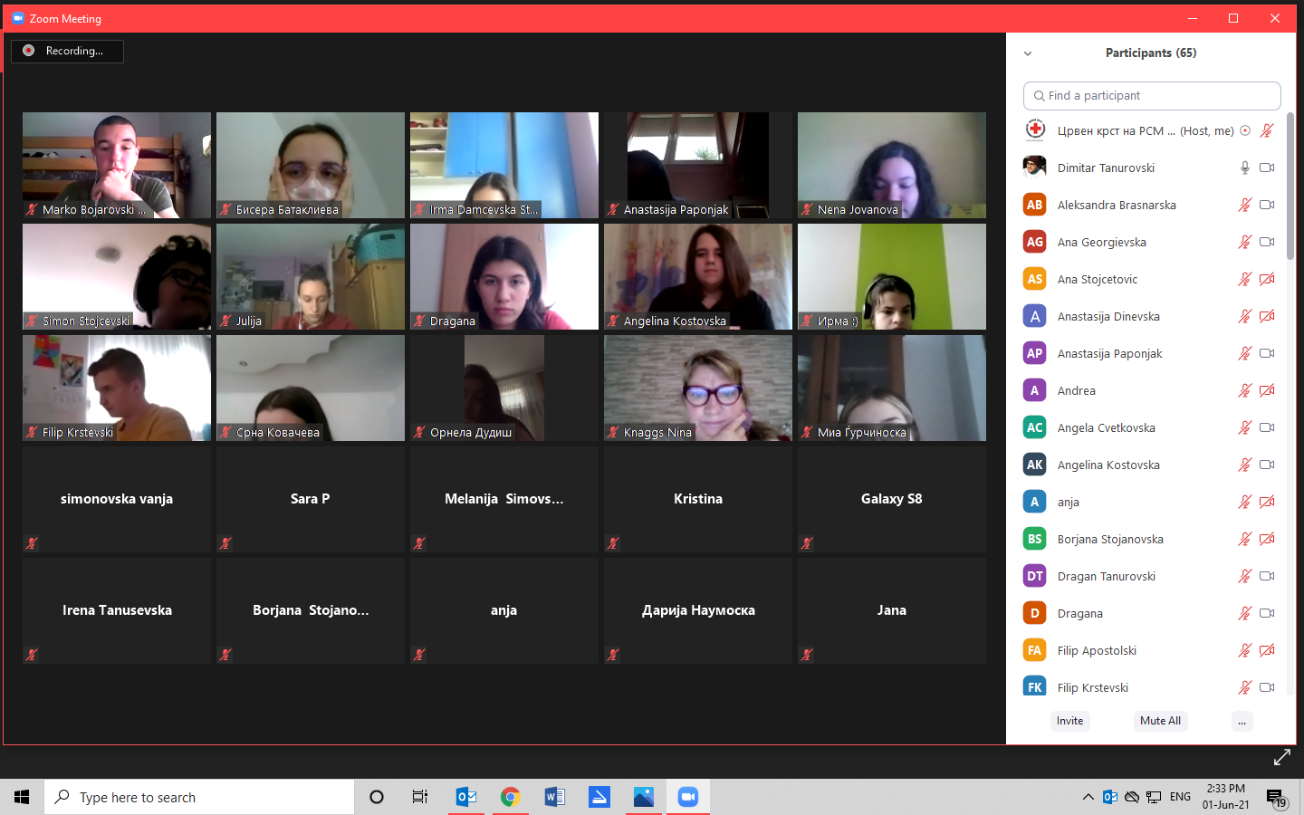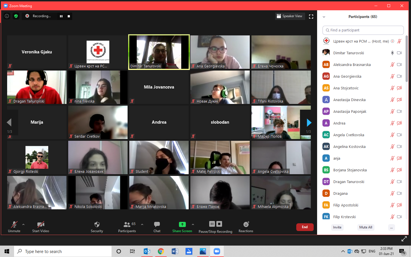Оваа година, согласно сите мерки од страна на Владата на РСМ, Општинска организација Центар одлучи да реализира Online Квиз по Прва помош, каде повторно ќе се обединат сите основни и средни училишта и Клубот на млади. По предавањата по прва помош кои се реализираа на 20-ти и 21-ви мај, Квизот се спроведе на 01.06.2021 во 14 часот. Сите 11 екипи со по 6 учесници се вклучија во екипно одговарање на прашањата од квизот.