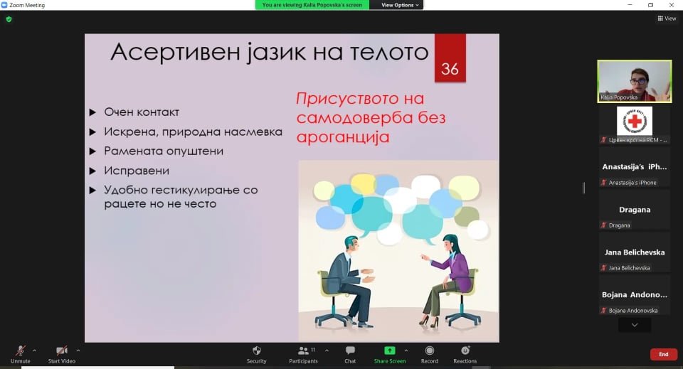 Црвен крст на Република Северна Македонија – Општинска организација Центар спроведе работилница на тема „Асертивна комуникација“. Десет волонтери од Клубот на млади се вклучија на онлајн работилницата реализирана од страна на волонтерката Калиа Поповска, која е дипломиран психолог. За време на работилницата, која се одржа на ден 14.11.2021 година во периодот од 18 до 20 часот, волонтерите имаа можност, преку примери, да се запознаат со значењето на терминот “асертивна комуникација“ и што тоа претставува. Работилницата беше интерактивна, а се опфатија повеќе аспекти, поконкретно какви типови на комуникација постојат, што претставува активна, а што пасивна комуникација, како асертивната комуникација помага во градењето на меѓучовечки односи и што претставува и какво влијание има асертивниот говор на телото.