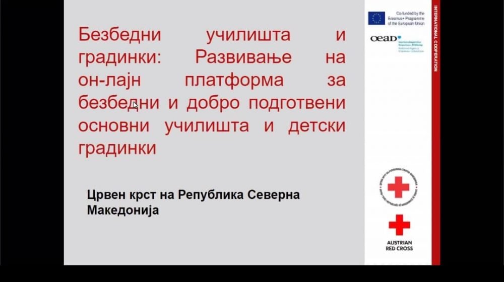 Црвен крст на Република Северна Македонија – Општинска организација Центар, во изминатиот период, реализираше три дисеминациски сесии за проектот ЕРАЗМУС+. Сесиите се реализира online преку платформата ZOOM. На овие дисеминациски сесии беа вклучени вработени од училиштето ООУ „Киро Глигоров“, градинката ЈУДГ „Раде Јовчевски – Корчагин“ со претставници од сите нејзини клонови, како и волонтерите од Клубот на млади при Црвен крст на РСМ – Општинска организација Центар. На сесиите, учесниците се запознаа со проектот ЕРАЗМУС+ насловен “Безбедни училишта и градинки“. Освен тоа, тие се запознаа и со можностите за понатамошно зајакнување на нивните капацитети, односно со Каталогот на ресурси и Онлајн платформата за намалување на ризици од катастрофи, прва помош и психосоцијална поддршка. Дополнително се запознаа со можните обуки за намалување на ризици од катастрофи, како за децата кои се дел од воспитно-образовниот процес, така и за вработените во овие институции.