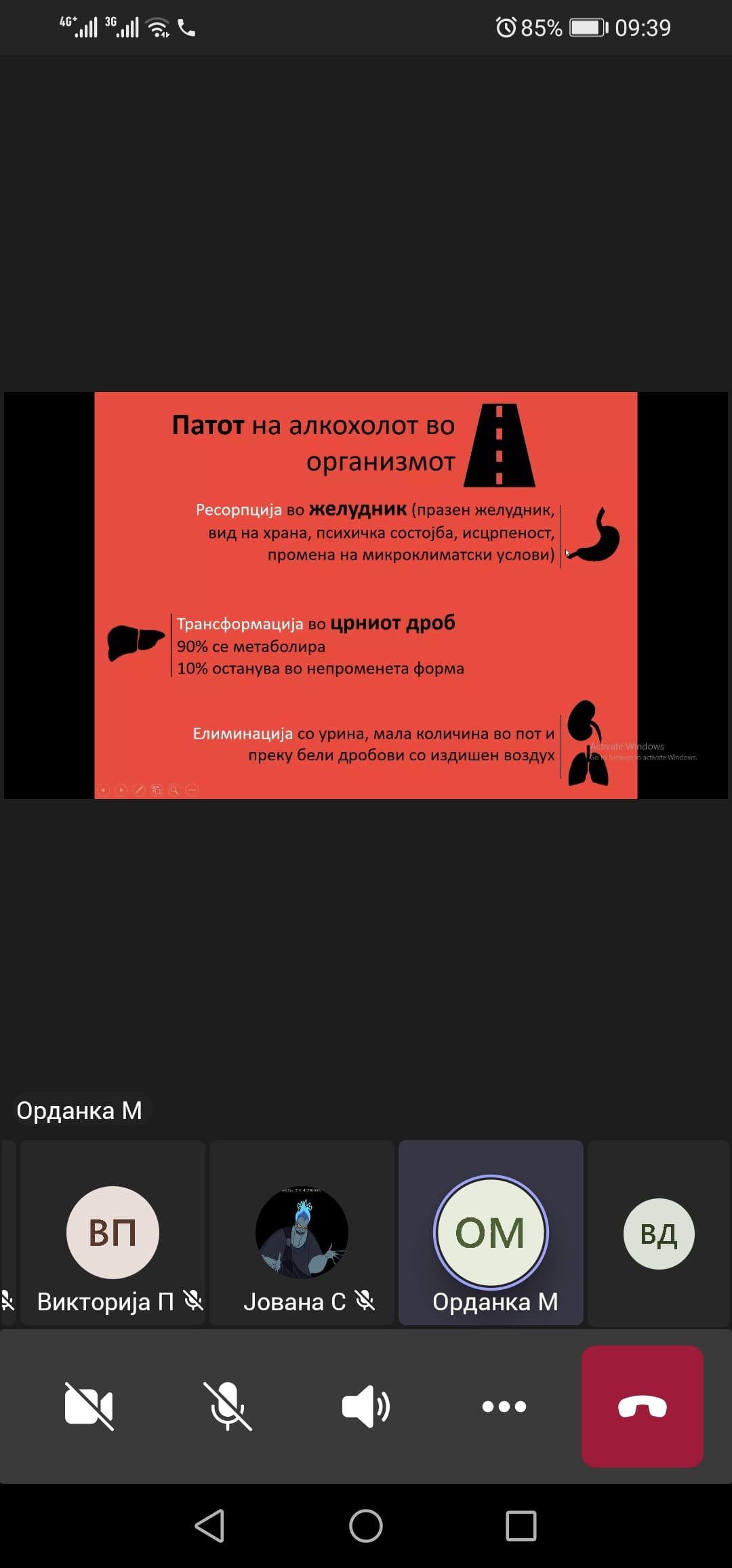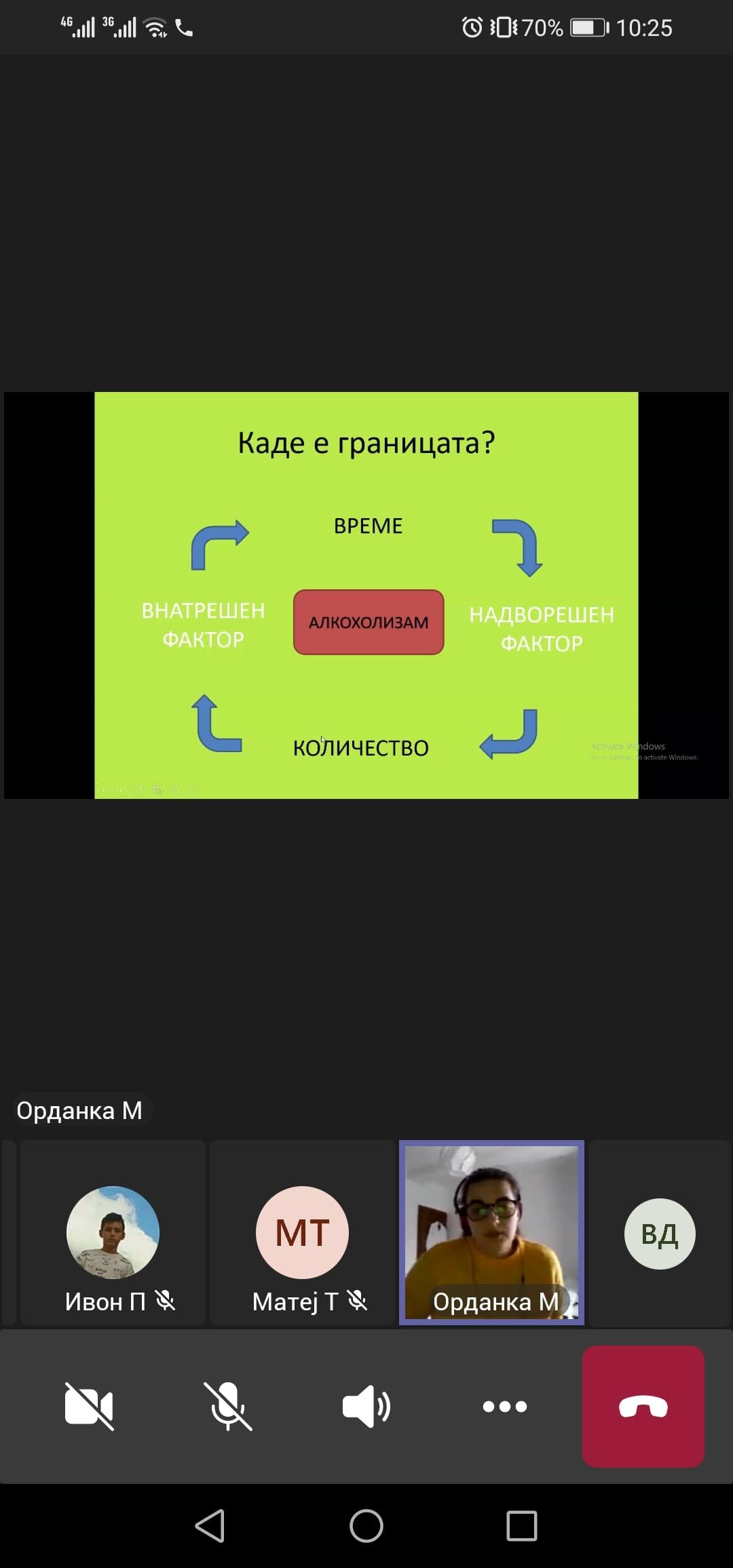 Се опфатија повеќе аспекти на алкохолизмот, односно што претставува алкохолизмот, на кој начин може да се доведе човекот во таква состојба, кои се симптомите и како да препознаеме лице во алкохолизирана состојба, какви ефекти и штетни влијанија има алкохолот врз човековото тело. Учениците поставуваа интересни прашања на темата и дискутираа за различните можни последици од консумирањето на алкохолот.
