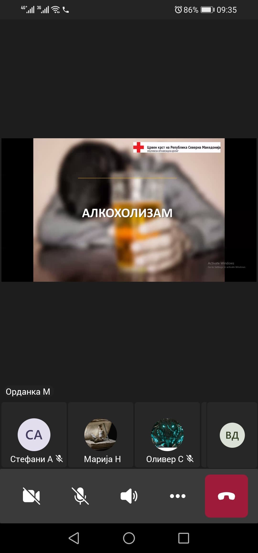 Црвен крст на Република Северна Македонија – Општинска организација Центар на ден 16.04.2021 година реализираше 3 едукации на тема „Алкохолизам“ во ООУ “Димитар Миладинов”. На едукациите, кои се одржаа online преку платформата Microsoft Teams, учествуваа 79 ученици од 8мо одделение.