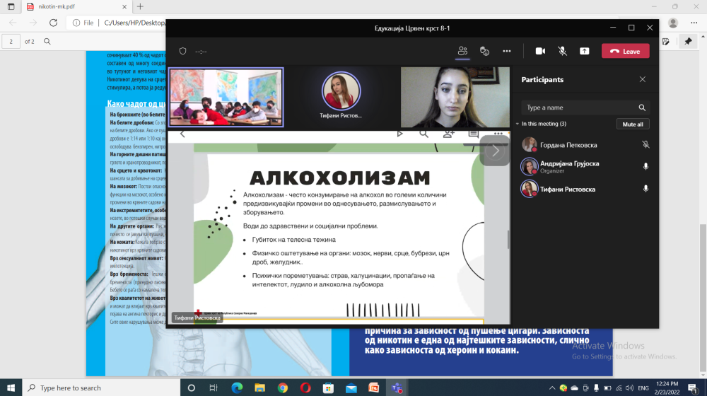 Врсничките едукатори од Црвен крст на Република Северна Македонија – Општинска организација Центар реализираа online врсничка едукација на тема „Првенција од болести на зависност“ со акцент на зависностите од цигари и алкохол. Едукацијата ја спроведоа во ООУ „Кирил и Меториј“ на ден 23.02.2022 (среда) со почеток во 12 часот.