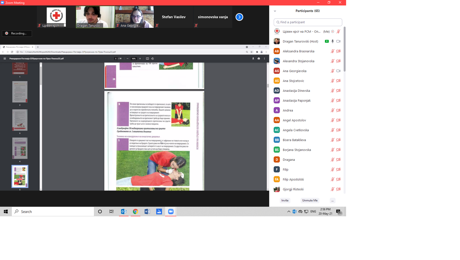 За реализација на оваа активност, успешно беа спроведени 2 предавања по Прва помош на 20-ти и 21-ви мај 2021 година во периодот од 14.30 до 16.30 часот. Предавањата беа реализирани преку платформата ZOOM од страна на сертифициран демонстратор по прва помош – Драган Тануровски. На предавањата учествуваа 66 учесници, односно 11 екипи. Учесниците имаа можност да се запознаат со основите на првата помош, преку употреба на селектирани поглавја од Прирачникот по прва помош за возачи. Освен теоретски осврт, тие имаа можност да погледнат видеа во кои практично се прикажува санирање на повредите кои ги изучуваат.